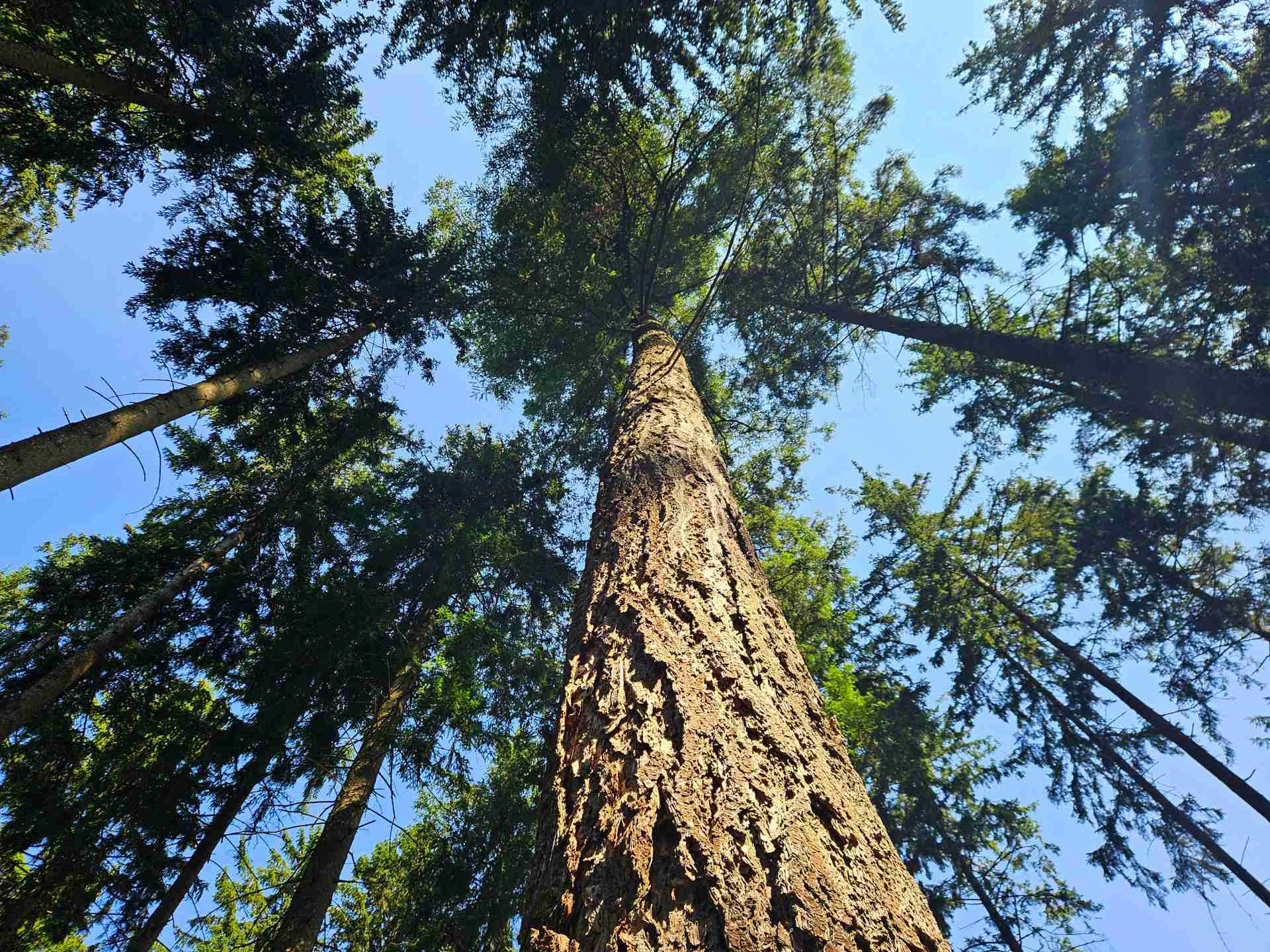 Was besonders schön hervorsticht und diesen Wald auch von Wäldern im Umfeld unterscheidet, ist die Beimischung von Lärche im Altholz wie auch in den naturverjüngten, jüngeren Beständen. Die starken Douglasien im Westen der Fläche beeindrucken durch ihren mächtigen Stammumfang.