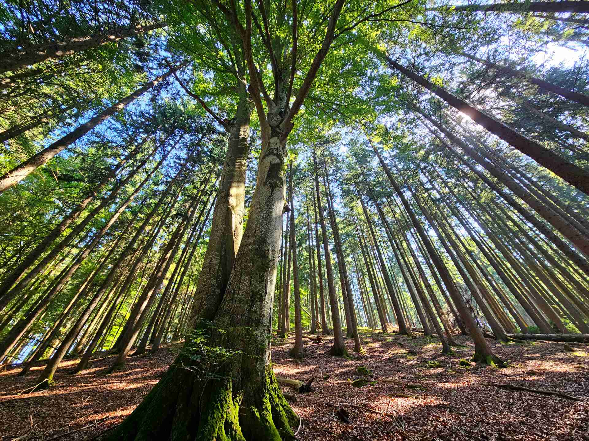 Im Westen und Osten stehen geschlossene Altbestände, die bereits 2022 vorsichtig aufgelichtet wurden. Dadurch konnte sich schön die natürliche Verjüngungen etablieren und zu einer zweischichtigen Struktur führen. Weitere Teilbereiche stehen noch geschlossen.